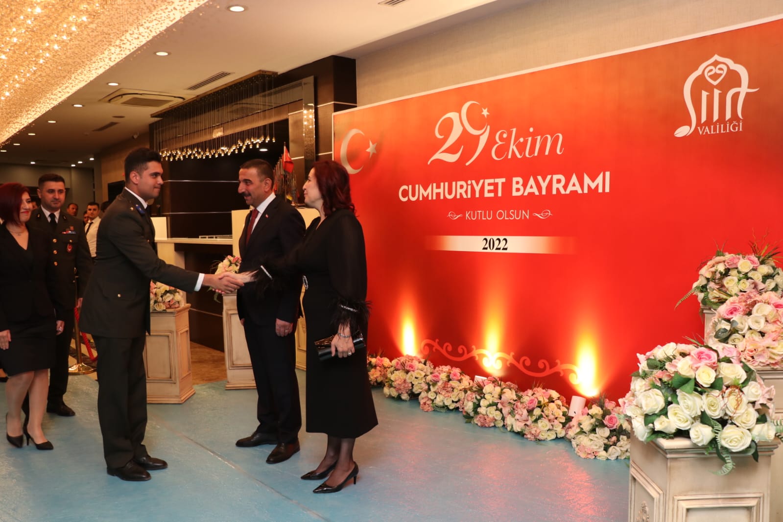 Vali Hacıbektaşoğlu eşi Güney Hacıbektaşoğlu, Cumhuriyet kabul törenine katılan konukları kapıda karşılayarak, davetlilerin Cumhuriyet Bayramını kutladılar.Programda konuşan Vali Hacıbektaşoğlu, Cumhuriyetin kuruluşunun yıl dönümünde bir arada bulunmanın mutluluğunu yaşadıklarını söyledi.Cumhuriyet'in 99'uncu yılında Türkiye'nin vizyon projeleri arasında yer alan Togg'un üretildiğini belirten Vali Hacıbektaşoğlu,” Bugün Türkiye savunma sanayisinde insansız hava araçlarını Avrupa ve dünyaya satmaktadır. Türkiye, bugün insansız muharip uçağını üretmektedir. Cumhuriyet'in 2'nci yüzyılında bizim en büyük gücümüz olan birliğimizi, beraberliğimizi muhafaza ederek inşallah çok daha büyük hayallerle, ümitlerle dünya sahnesinde yerimizi alacağız." diye konuştu.Daha sonra Vali Hacıbektaşoğlu eşi Güney Hacıbektaşoğlu ve diğer protokol üyeleri ile birlikte günün anısına üzerine ‘99. yıl’ yazan pastayı kesti. Program, Vali Hacıbektaşoğlu’nun masaları tek tek gezerek, kabul törenine katılan şehit ve gazi aileleri ile diğer konuklarla sohbet etmesiyle sona erdi.Kabul törenine; Siirt Cumhuriyet Başsavcı Vekili Mehmet Çetiner, Adalet Komisyonu Başkanı Erhan Obut, İdare Mahkemesi Başkanı Mehmet Altay, Siirt Üniversitesi Rektör Vekili Prof. Dr. Tekin Şahin, İl Jandarma Komutanı Tuğgeneral Emrullah Büyük, kurum müdürleri, svil toplum örgütlerinin temsilcileri ile şehit aileleri ve gaziler katıldı.