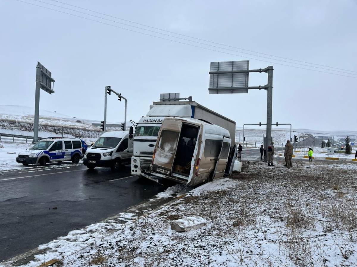 <div>AĞRI (AA) - Ağrı'nın Tutak ilçesinde tır ile minibüsün çarpışması sonucu 2'si ağır 8 kişi yaralandı.</div><div>Tutak-Patnos kara yolunda M.H.E. idaresindeki 10 KB 140 plakalı tır ile C.B'nin kullandığı 04 M 5177 plakalı minibüs Karayazı Kavşağında çarpıştı.</div><div>İhbar üzerine kaza yerine polis, jandarma ve sağlık ekipleri sevk edildi.</div><div>Kazada sürücüler ile minibüste bulunan yolculardan E.G, M.R.T, M.G, N.Ç, İ.Ç. ve M.B. yaralandı.</div><div>Tutak Devlet Hastanesi'ne kaldırılan yaralılardan durumu ağır olan minibüs sürücüsü C.B ile M.G, Ağrı Eğitim ve Araştırma Hastanesine sevk edildi.</div><div>Öte yandan kaza anı, güvenlik kamerasınca kaydedildi.</div>