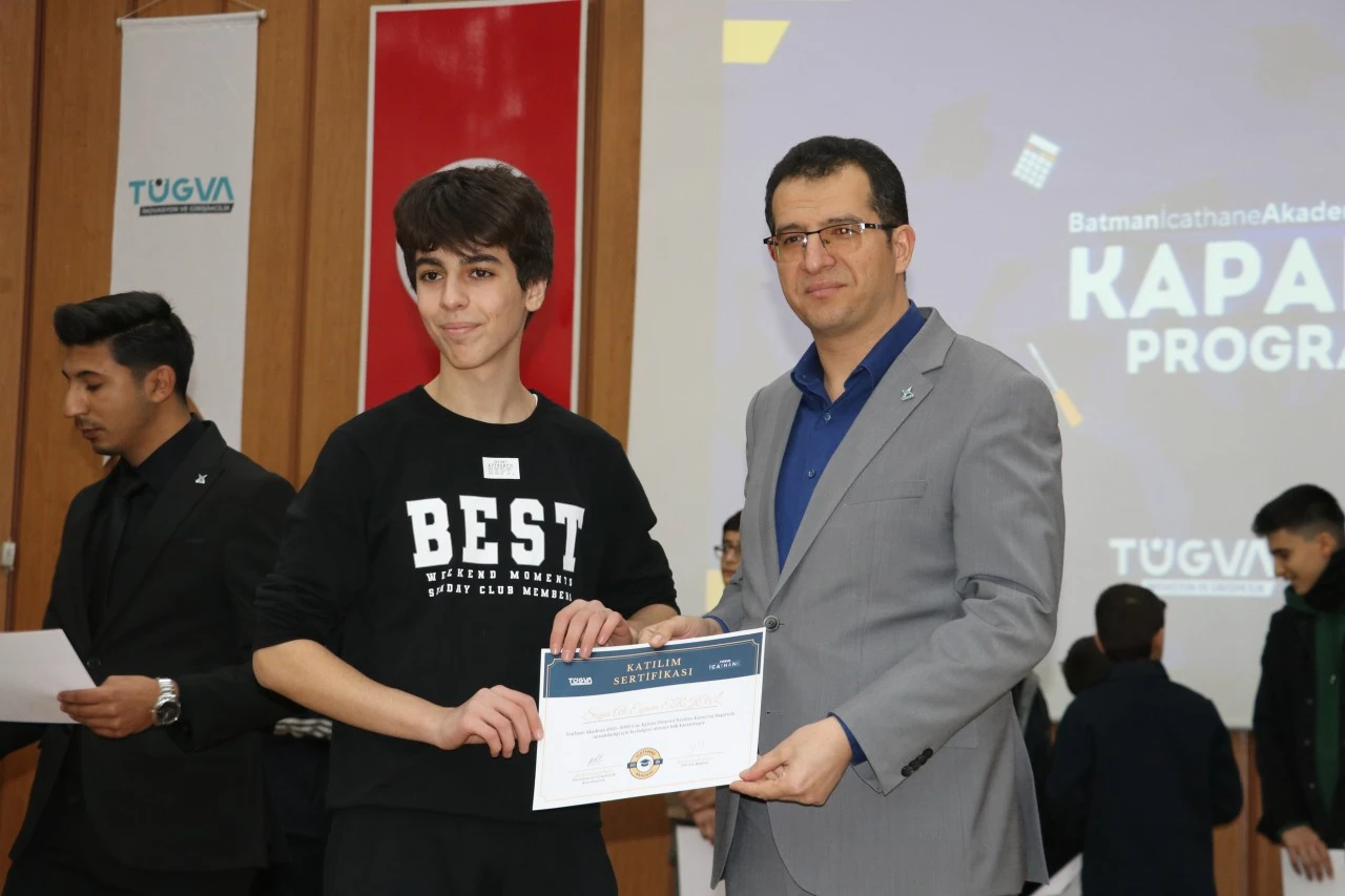 Batman Üniversitesi merkez kampüs konferans salonunda düzenlenen tören, saygı duruşunda bulunulması ve İstiklal Marşı'nın okunmasıyla başladı. <div>Atölyede geçen yıl ekim ayında eğitime başlayan ortaokul ve lise öğrencileri, yazılım, robotik kodlama, endüstriyel tasarım ve yapay zeka alanlarında eğitim aldı.</div> <div>Birinci dönem eğitimlerini başarıyla tamamlayan 224 öğrenciye, törenle sertifikaları takdim edildi.</div> <div>TÜGVA İl Başkanı Mehmet Onutçu, programda yaptığı konuşmada, icathanede yetişen öğrencilerin Batman'da ve ülkede söz sahibi olacaklarını söyledi.</div> <div>İcathanenin gençler için üretim, gelişim ve değer merkezi olduğunu kaydeden Onutçu, şunları kaydetti:</div> <div>"Öğrencilerimiz aldıkları her dersin sonunda kıymetli hocalardan da değerler eğitimi aldı. Her dönem dört kitap okuyacak şekilde zihinsel hem de ahlaki yönden gelişmelerine destek olundu. Her yıl TEKNOFEST yarışmalarına dahil olduk ve geçtiğimiz yıl dört finalist çıkarmanın gururunu yaşadık."</div> <div>Törene, AK Parti İl Başkanı Hüseyin Şansi, icathane eğitimcileri, öğrenciler ve aileleri katıldı.</div>