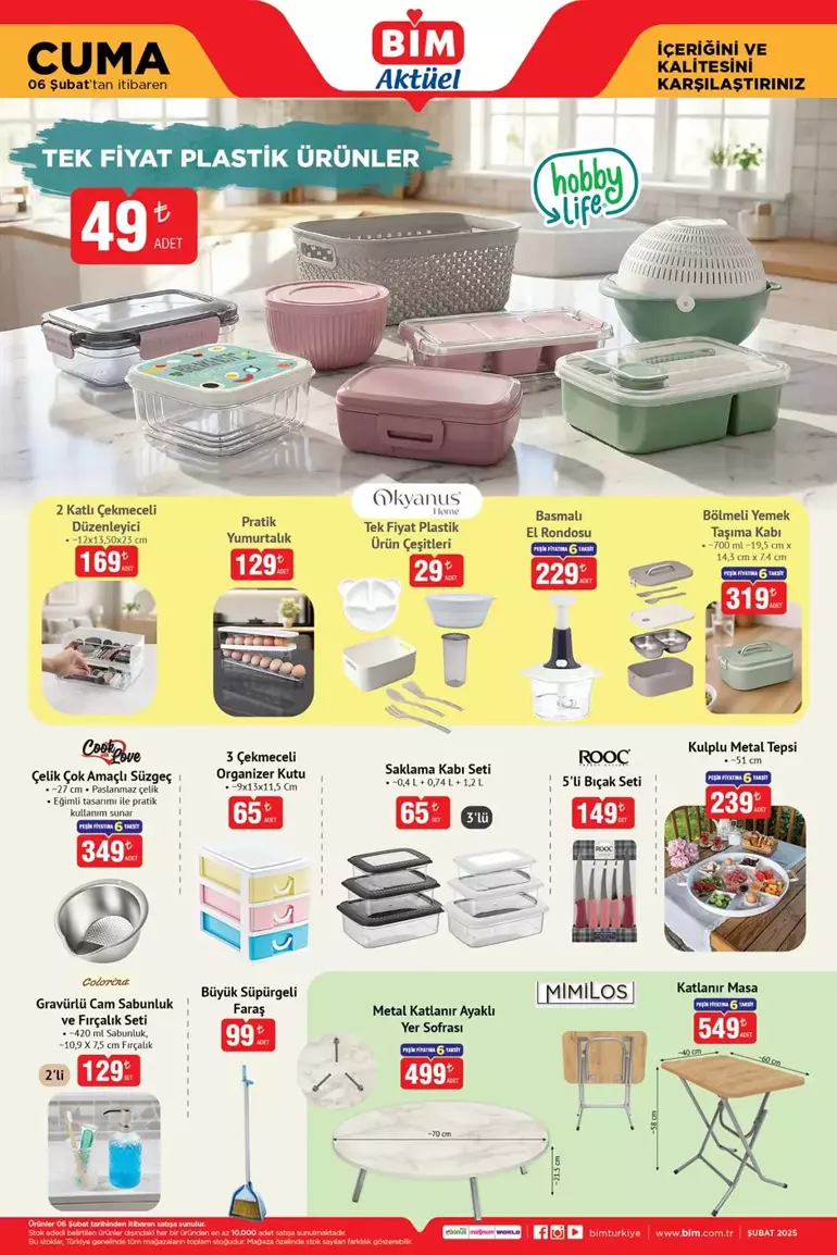 <div data-end="747" data-start="360"></div> <div data-end="747" data-start="360"></div> <div data-end="747" data-start="360"></div> <div data-end="747" data-start="360"></div> <div data-end="747" data-start="360"></div> <div data-end="747" data-start="360"></div> <div data-end="747" data-start="360">6 Şubat BİM aktüel ürünleri, yeni haftaya bütçe dostu seçeneklerle başlamak isteyen ailelerin ilgisini çekiyor. Saç düzleştirici tarak, üflemeli saç şekillendirme seti ve şarjlı elektrikli diş fırçası gibi kişisel bakım ürünleri, bu hafta öne çıkan indirimli ürünler arasında bulunuyor. Kişisel bakım kategorisindeki kampanyalar, yüksek fiyatlı ürünleri daha erişilebilir hale getiriyor.</div> <div data-end="1031" data-start="749">BİM mağazalarında 3-6 Şubat tarihleri arasında satışa sunulacak aktüel ürünler listesinde elektronik ürünler de yer alıyor. Powerbank, yaka mikrofonu, dijital kamera ve fotoğraf makinesi gibi ürünler, teknolojiye uygun fiyatlarla ulaşmak isteyen tüketicilere alternatif oluşturuyor.</div> <div data-end="1389" data-start="1033">Mutfak ve ev gereçleri kategorisinde ise 6’lı cam kupa, cam fiyonk desenli kapaklı kase, kalp kapaklı gravürlü cam kavanoz, desenli bambu servis ve sunum seti, pratik yumurtalık ve çelik çok amaçlı süzgeç gibi ürünler dikkat çekiyor. Düzenleyici ürünler arasında 3 çekmeceli organizer kutu yer alırken, dekoratif aydınlatma ürünleri de katalogda bulunuyor.</div> <div data-end="1631" data-start="1391">Tekstil grubunda sweatshirt, pijama takımı, tek kişilik battaniye, örgü ipleri, nevresimler ve çorap çeşitleri indirimli olarak raflarda yerini alıyor. Ayrıca aktüel katalogda çerçeve ve kitap çeşitleri de uygun fiyatlarla satışa sunuluyor.</div> <div data-is-only-node="" data-is-last-node="" data-end="1875" data-start="1633">Uygun fiyat politikasıyla öne çıkan BİM, 6 Şubat 2026 aktüel kataloğuyla temel ihtiyaçlardan tamamlayıcı ürünlere kadar birçok ürünü tüketiciyle buluşturuyor. İndirimli ürünler, 6 Şubat Cuma günü itibarıyla BİM mağazalarında satışa sunulacak.</div>