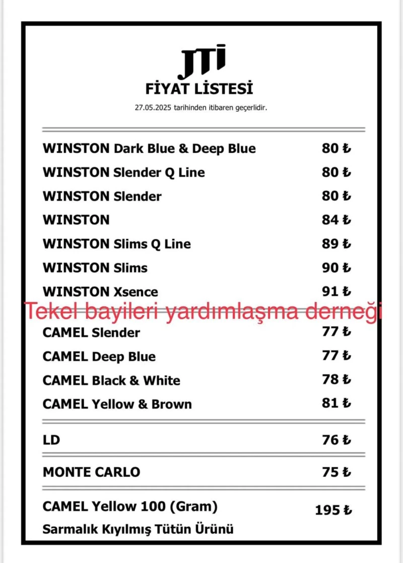<div>JTİ sigara grubuna zam yapıldı. Zammı, Tekel Bayileri Yardımlaşma Derneği Başkanı Erol Dündar sosyal medya hesabından duyurdu.</div> <div>Dündar, X platformu üzerinden yaptığı açıklamada, “Bir maliyet zammı da sigaraya, JTİ sigara grubuna zam geldi” ifadelerini kullandı.</div> <div>Güncellenen fiyat listesine göre JTİ grubundaki en ucuz sigara 75 liraya, en pahalı sigara ise 91 liraya yükseldi.</div> <div>Zamlı fiyatların 27 Mayıs 2025 Salı gününden itibaren geçerli olacağı bildirildi.</div> <div></div> <div> </div> <div> </div> <div>(Haber Merkezi)</div>