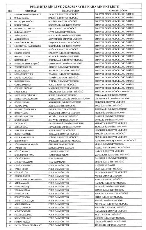<div data-end="796" data-start="515">Kararnamede dikkat çeken hususlardan biri de Antalya İl Emniyet Müdürlüğü oldu. ‘Rüşvet’ soruşturması kapsamında tutuklanarak görevden alınan eski Antalya İl Emniyet Müdürü İlker Arslan merkeze çekildi. Arslan’ın yerine Bursa İl Emniyet Müdürü Sabit Akın Zaimoğlu atandı.</div> <h4 data-end="826" data-start="798">Yeni Görevlendirmeler</h4> <div data-end="916" data-start="829">Diyarbakır İl Emniyet Müdürü Fatih Kaya, Emniyet Genel Müdür Yardımcısı oldu.</div> <div data-end="1017" data-start="919">Özel Harekât Başkanı Süleyman Karadeniz, Muğla İl Emniyet Müdürü olarak görevlendirildi.</div> <div data-end="1118" data-start="1020">Terörle Mücadele (TEM) Daire Başkanı Ergün Dağıstanlı, Çanakkale İl Emniyet Müdürü oldu.</div> <div data-end="1213" data-start="1121">Emniyet Koruma Daire Başkanı Tamer Taş, Kastamonu İl Emniyet Müdürü olarak atandı.</div> <div data-end="1327" data-start="1216">Kaçakçılık ve Organize Suçlarla Mücadele (KOM) Başkanı Şükrü Yaman, Balıkesir İl Emniyet Müdürü oldu.</div> <div data-end="1415" data-start="1330">Trafik Başkanı Muhittin Ayhan, Edirne İl Emniyet Müdürü görevine getirildi.</div> <h4 data-end="1445" data-start="1417">Merkeze Çekilen İller</h4> <div data-end="1669" data-start="1446">Şırnak, Bartın, Bitlis, Erzurum, Uşak, Sivas, Malatya, Adıyaman, Kırşehir, Karabük, Muğla, Bilecik, Çanakkale, Kırıkkale, Giresun, Antalya, Trabzon, Mersin, Tunceli, Bolu ve Mardin’in il emniyet müdürleri merkeze çekildi.</div> <div data-end="1669" data-start="1446"></div> <div data-end="1669" data-start="1446"></div>