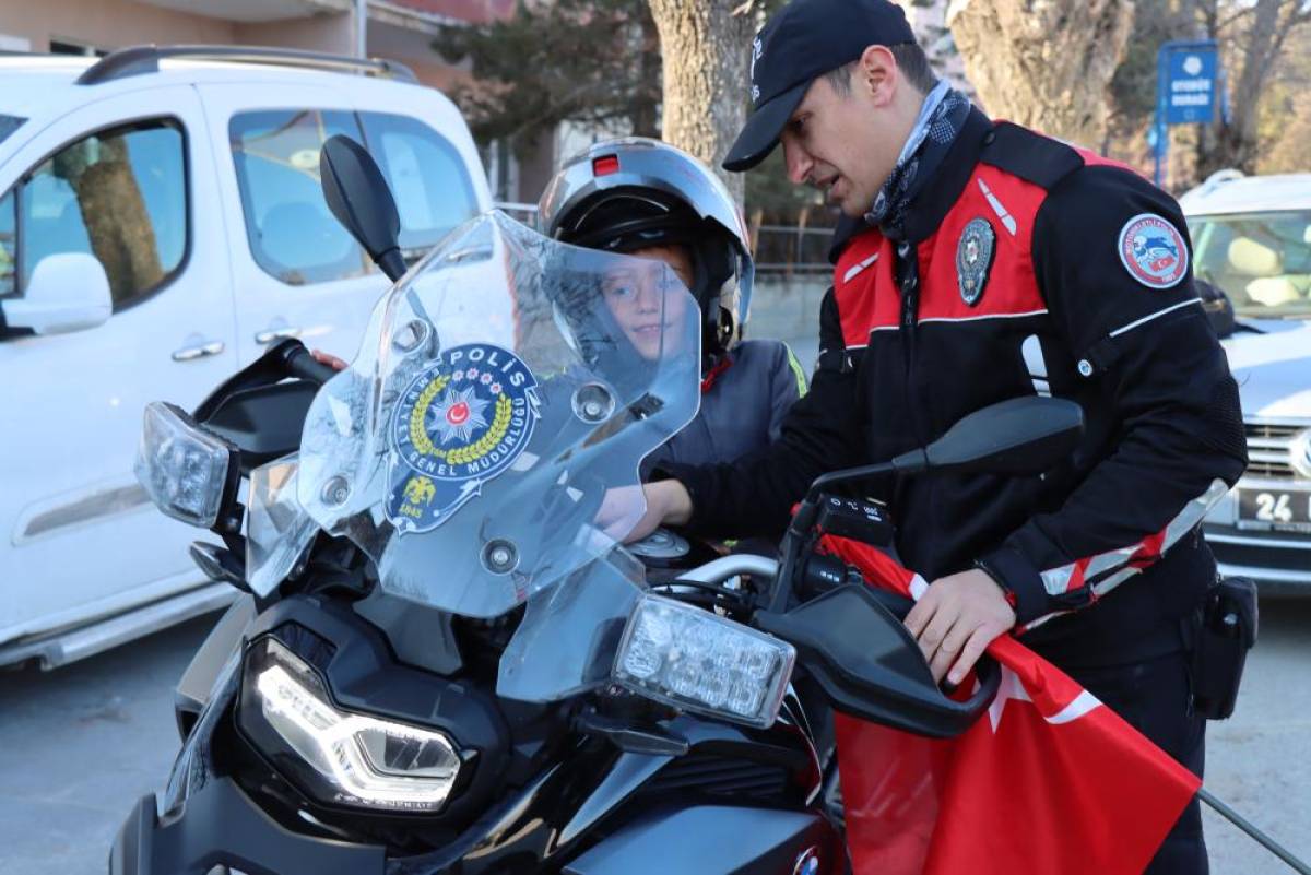 <div>ERZİNCAN (AA) - Erzincan'da 6 yaşındaki Ahmet Asaf Şimşek'in yunus polisleriyle tanışma hayalini, Vali Hamza Aydoğdu gerçekleştirdi.</div><div>Şimşek, sosyal medya üzerinden babası Salih Şimşek ile Vali Aydoğdu'ya yunus polisleriyle tanışmak için mesaj attı.</div><div>Aydoğdu tarafından talebin uygun karşılanması üzerine aileyle iletişime geçen İl Emniyet Müdürlüğü ekipleri, Şimşek'in Kazım Karabekir Mahallesi'ndeki evine gitti.</div><div>Ekiplerin motosiklet üzerine bindirdiği Ahmet Asaf, daha sonra polis otosuyla gezdirildi.</div><div>Polis ağabeyleriyle bir araya geldiği için çok mutlu olduğunu ve yunus polisi olma hayali kurduğunu dile getiren Şimşek, Vali Aydoğdu ile polislere teşekkür etti.</div><div>Baba Salih Şimşek ise çocuğunun hayalinin gerçekleştiğini belirterek, emeği geçenlere teşekkür etti.</div><div>Öte yandan polis ekipleri, yol kenarından kendilerini izleyen engelli kişinin de motosiklete binme talebini karşılıksız bırakmadı.</div>