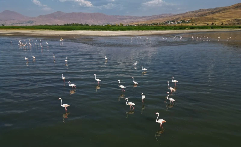 <span></span> <span>Türkiye'nin en önemli sulak alanlarının bulunduğu Van Gölü Havzası, yaz aylarında yüzlerce flamingoya konaklama imkanı sunuyor.</span> <div>Havaların ısınmasıyla konaklamak için Van Gölü'ne gelen binlerce flamingo, iri gövdeleri, zarif boyunları ve uzun bacaklarıyla ziyaretçilerin dikkatini çekiyor.</div> <div>Van Gölü'nün Muradiye ilçesi kıyılarında yoğunluk oluşturan flamingolar, doğaseverlerin yanı sıra fotoğraf tutkunları tarafından da ilgiyle izleniyor.</div> <div>Bölgeye gelen doğa meraklısı fotoğrafçılar, gölde geniş bir beslenme alanı bulan flamingoların doğal yaşamını karelerine yansıtıyor.</div> <div>- "Flamingoların renkli görüntüleri görsel şölen sunuyor"</div> <div>Doğa fotoğrafçısı Ayşenur Köse, AA muhabirine, fırsat buldukça Van Gölü kıyılarındaki kuş türlerini fotoğraflayarak kayıt altına almaya çalıştığını söyledi.</div> <div>Flamingoların bölgeye renk kattığını belirten Köse, şunları kaydetti:</div> <div>"Van Gölü birçok kuş türüne ev sahipliği yapmakta. Yakında göç edecek olan flamingoları çektim. Çok güzel kareler çektim. Tüm fotoğrafçıları ve doğaseverleri flamingoları görmeleri için buraya davet ediyorum. Van Gölü'nün benzersiz doğasında flamingoların zarif ve renkli görüntüleri görsel şölen sunuyor. Eskiden sayıları çok azdı, son yıllarda sayılarının arttığını gözlemliyoruz. Birçok alanda sürüler halinde görmek mümkün. Onları fotoğraflamak eşsiz bir duygu."</div> <div></div> <div>(AA)</div>