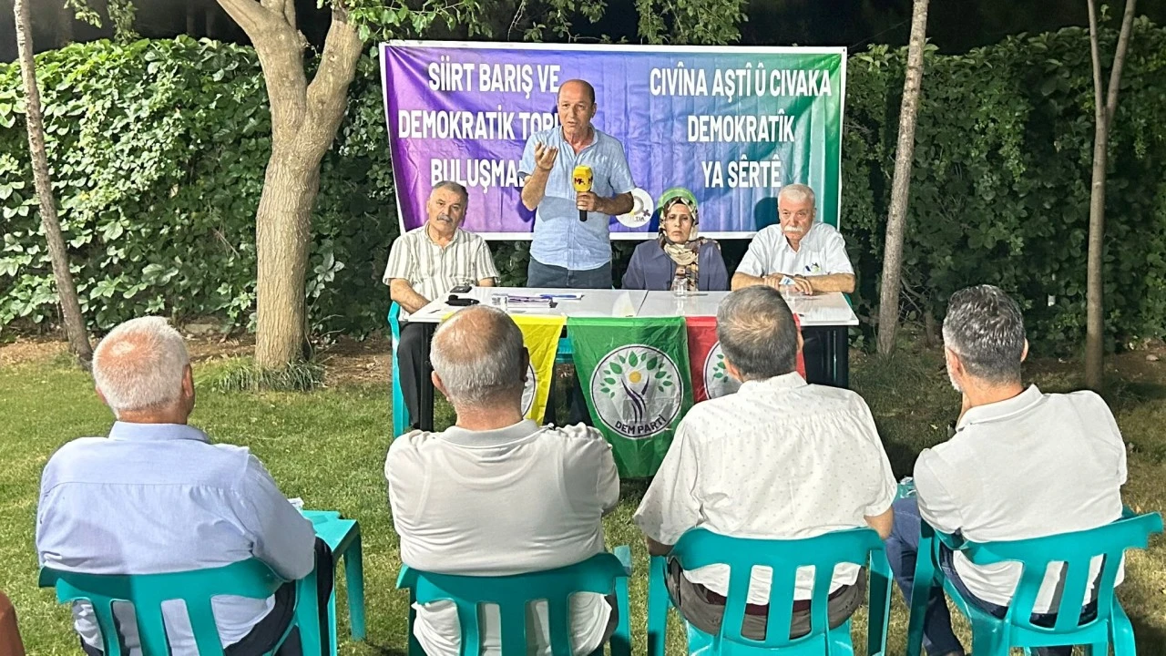 <div></div> <div>Toplantıya konuşmacı olarak DBP Parti Meclisi üyesi Hikmet Duman, DEM Parti Kurtalan İlçe Başkanı Nail Asma ve DBP Siirt İl Eş Başkanı Naze Bulda katıldı. Katılımcılar barış, eşitlik, kadın özgürlüğü ve demokratik siyaset konularında değerlendirmelerde bulundu.</div> <div>Etkinlikte konuşmacılar, toplumsal barışın önemine dikkat çekerek, halkla birlikte karar alma süreçlerini güçlendirmek istediklerini belirtti. Toplantı, vatandaşların sorunlarını ve taleplerini dile getirme imkanı bulduğu, diyalog ve dayanışma ortamı içinde geçti.</div> <div>Etkinlik sonunda yapılan açıklamada, benzer halk buluşmalarının ilçe genelinde sürdürüleceği ifade edildi.</div> <div> </div> <div>(Ahmet Şinasi KILIÇASLAN)</div>