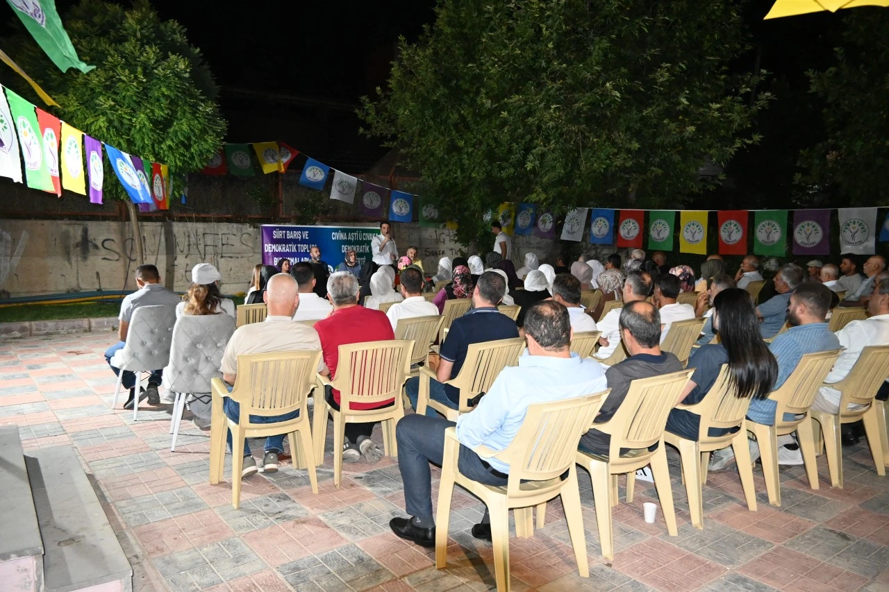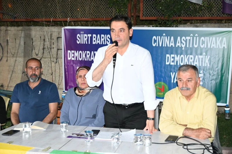 <div></div> <div>Toplantıya, Kurtalan Belediye Eş Başkanı Ali Rıza Bingöl, DEM Parti Kurtalan İlçe Eş Başkanı Nail Asma, DEM Parti Siirt eski İl Eş Başkanı Eşref Tekin, DBP Siirt İl Eş Başkanı Naze Bulga, DBP Siirt İl Yöneticisi Mehmet Can Nas, DEM Parti Siirt İl Yöneticisi Kıymet Mut, Kurtalan Belediyesi Meclis Üyeleri ve çok sayıda vatandaş katıldı.</div> <div>Toplantıda konuşan DEM Parti Siirt eski İl Eş Başkanı Eşref Tekin, barış süreciyle ilgili önemli açıklamalarda bulundu.</div> <div></div> <div>Tekin, şu ifadeleri kullandı:</div> <div>“10 aydır bu süreç başladı. Öcalan tüm gücüyle elini taşın altına koydu. Silah devreden çıksın, barış olsun, özgürlük olsun, eşitlikçi bir anayasa olsun. Hep birlikte binlerce yıl daha özgürce yaşayalım istiyoruz.</div> <div>Süreç içerisinde provokasyonlar oldu, bu provokasyonlara karşı duyarlı olmak gerekir. İyi bir barış ve eşitlikçi bir anayasa olursa Türkiye, tüm halklarıyla birlikte ileriye gidecek. Bu barış fırsatını kaçırmamak gerekir.</div> <div>‘Müzakere yapılıyor, devlet neden adım atmıyor?’ gibi sorular geliyor. Ama biz burada iki aşireti barıştırmıyoruz. Bu büyük bir mesele. Biraz sabır gerekiyor. Adımlar atılıyor, aşama aşama ilerliyor. Türkiye genelinde toplam 2000 toplantı düzenlenecek; barış ve kardeşlik mesajı her yere ulaşacak.”</div> <div>Toplantının sonunda vatandaşlardan gelen sorular yanıtlandı.</div> <div> </div> <div>(Sıbgatullah BİNAY)</div>