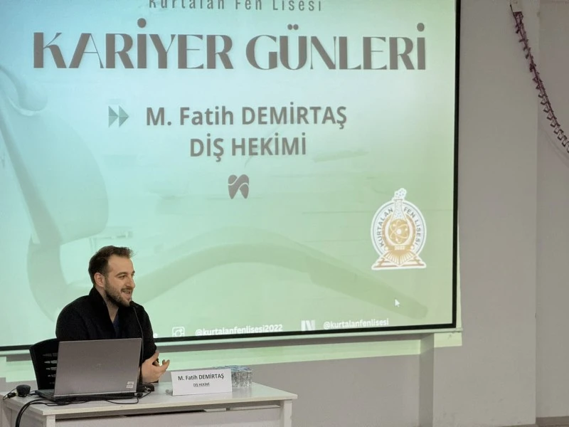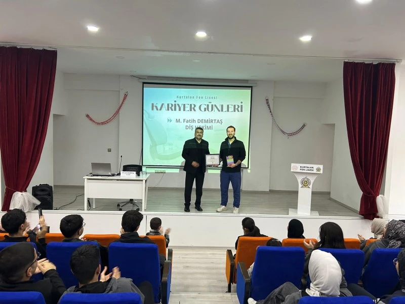 <div data-end="330" data-start="70"></div> <div data-end="768" data-start="332">Okulun konferans salonunda gerçekleştirilen programa öğrenciler yoğun ilgi gösterdi. Demirtaş, diş hekimliği mesleğinin çalışma alanları, eğitim süreci, modern tedavi uygulamaları ve gelecekte bu alanda beklenen gelişmelere ilişkin ayrıntılı bilgiler paylaştı. Ağız ve diş sağlığının önemine değinen Demirtaş, öğrencilerden gelen soruları yanıtlayarak meslek seçiminde ilgi ve yeteneklerin doğru değerlendirilmesi gerektiğini vurguladı.</div> <div data-end="768" data-start="332"></div> <div data-is-only-node="" data-is-last-node="" data-end="992" data-start="770">Program sonunda okul müdürü Ferit Yavuz tarafından Diş Hekimi M. Fatih Demirtaş’a teşekkür belgesi takdim edildi.</div>