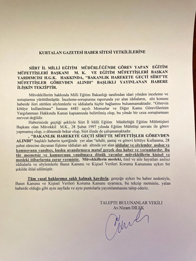 <div>KURTALAN GAZETESİ HABER SİTESİ YETKİLİLERİNE</div> <div data-end="461" data-start="215">Siirt İl Milli Eğitim Müdürlüğünde görev yapan Eğitim Müfettişleri Başkanı M.K. ve Eğitim Müfettişleri Başkan Yardımcısı H.G.K. hakkında, "BAKANLIK HAREKETE GEÇTİ SİİRT'TE MÜFETTİŞLER GÖREVDEN ALINDI" başlıklı yayımlanan habere ilişkin tekziptir.</div> <div data-end="907" data-start="463">Müvekkillerim hakkında Milli Eğitim Bakanlığı tarafından idari yönden inceleme ve soruşturma yürütülmüştür. İnceleme-soruşturma raporunda yer alan iddiaların, söz konusu haberde ileri sürülen söylemlerle ve iddialarla hiçbir bağlantısı bulunmamaktadır. "Görevin kötüye kullanılması" hususu 4483 sayılı Memurlar ve Diğer Kamu Görevlilerinin Yargılanması Hakkında Kanun kapsamında belirtilmiş olup, bu yönde bir ceza soruşturması mevcut değildir.</div> <div data-end="1143" data-start="909">Haberinizde geçtiği şekliyle Siirt İl Milli Eğitim Müdürlüğü Eğitim Müfettişleri Başkanı olan müvekkil M.K., 28 Şubat 1997 yılında Eğitim Müfettişi unvanı ile görev yapmamış olup, o dönemde bekar olup, Siirt ilinde de çalışmamaktadır.</div> <div data-end="1751" data-start="1145">"BAKANLIK HAREKETE GEÇTİ SİİRT'TE MÜFETTİŞLER GÖREVDEN ALINDI" başlıklı haberin içeriğinde yer alan "tehdit, şantaj ve görevi kötüye kullanma, 28 Şubat sürecine dayanan fişleme iddiaları" adı altında yer alan iddialar ve söylemler asılsız ve kamuoyunu yanıltıcı, kuşku uyandırmaya matuf gerçek dışı haber ve yorumlardır. Bu tür mesnetsiz ve kamuoyunu yanıltmaya dönük yayınlar müvekkillerin kişisel ve mesleki itibarlarına zarar vermiştir. Müvekkillerin mesleki, özel ve aile hayatları asılsız iddialarla ve söylemlerle Basın Kanunu ve Kişisel Verileri Koruma Kanunu’na aykırı bir şekilde ihlal edilmiştir.</div> <div data-end="1995" data-start="1753">Tüm yasal haklarımız saklı kalmak kaydıyla; bu tekzip metninin, aynı sayfada ve aynı puntolarla yayımlanmasını talep ederiz.</div> <div data-end="2040" data-start="1997">TALEPTE BULUNANLAR VEKİLİ<br data-end="2025" data-start="2022">Av. Nizam DİLEK</div> <div data-end="2040" data-start="1997"></div> <div data-end="2040" data-start="1997"></div> <div> </div>