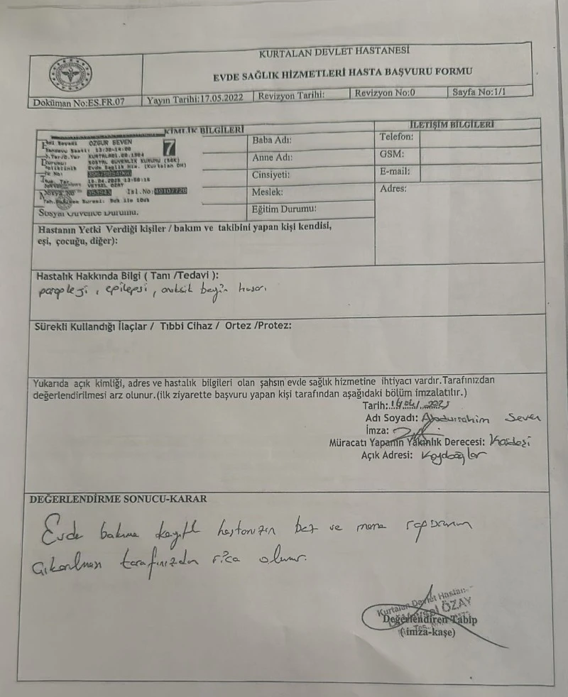<div>Ailesinin ifadelerine göre, Şanlıurfa’da geçirdiği trafik kazası sonucu yüzde 100 engelli hale gelen 41 yaşındaki Kurtalanlı Özgür Seven, yoğun bakımda tedavi altındayken polis gözetiminde hastaneden alınarak cezaevine sevk edildi. Sağlık durumu ağır olan Seven, şu anda Batman Eğitim ve Araştırma Hastanesi’nde hasta mahkumlara ayrılan, demir kapılarla korunan koğuşta tutuluyor.</div> <div><strong>Kardeşinin düğününe giderken kaza geçirdi</strong></div> <div>İstanbul’da yaşayan, evli ve 4 çocuk babası Özgür Seven, 2020 yılında göçmen kaçakçılığı suçundan aldığı hapis cezasını denetimli serbestlik kapsamında tamamlıyordu. Seven, 21 Haziran 2024’te kardeşinin düğünü için Kurtalan’a gelmek üzereyken Şanlıurfa’da trafik kazası geçirdi. Ağır yaralanan Seven, Şanlıurfa Mehmet Akif İnan Eğitim ve Araştırma Hastanesi’nde yaklaşık 10 ay boyunca yoğun bakımda kaldı.</div> <div>12 Nisan 2025’te evde bakım sürecine alınmak üzere taburcu edilen Seven, 20 Nisan’da sağlık durumunun kötüleşmesi üzerine Kurtalan Devlet Hastanesi’ne kaldırıldı ve yeniden yoğun bakım ünitesine alındı.</div> <div></div> <div><strong>Yoğun bakımdayken tutuklandı</strong></div> <div>Yüzde 100 engelli hale geldiği için denetimli serbestlik kapsamındaki imza yükümlülüğünü yerine getiremeyen Özgür Seven hakkında, savcılık tarafından tutuklama kararı çıkarıldı. Seven, yoğun bakımda tedavi altındayken 2 Mayıs 2025 tarihinde polis gözetiminde hastaneden alınarak Beşiri Cezaevi’ne gönderildi. Cezaevinde durumu daha da ağırlaşan Seven, aynı gün Batman Eğitim ve Araştırma Hastanesi’ne sevk edildi. Seven, burada hasta mahkumlara ayrılan ve demir kapılarla korunan koğuşta tutuluyor.</div> <div></div> <div><strong>Kardeşi Can Seven: “Bu insanlık dışı bir durum”</strong></div> <div>Özgür Seven’in kardeşi Can Seven, yaşananlara tepki göstererek şunları söyledi:</div> <div> “Ağabeyim yüzde 100 engelli. Ayağa kalkamıyor, konuşamıyor, bilinci yerinde değil ve mama ile besleniyor. Böyle bir hastayı yoğun bakımdan çıkarıp cezaevine göndermek insanlık dışı bir uygulamadır. Şu anda Batman Eğitim ve Araştırma Hastanesi’nin mahkum koğuşunda tutuluyor. Yanında 61 yaşındaki annem kalıyor ve bakımını üstlenmiş durumda. Bu şartlar hem ağabeyim hem de annem için sağlıksız. Ağabeyimin yaşama tutunabilmesi için uygun koşullarda, tam donanımlı bir yoğun bakım ünitesinde tedavi edilmesi gerekiyor. Devlet büyüklerine sesleniyorum: Lütfen bu duruma el atın. Ağabeyimin hayatı tehlikede.</div> <div> </div> <div>(Abdurrahman BİNAY)</div>