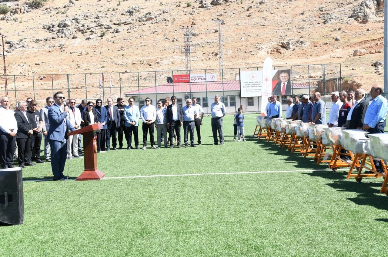 <div>Mardin Büyükşehir Belediyesi, Mazıdağı Kaymakamlığı, GAP Bölge Kalkınma İdaresi Başkanlığı ve Mazıdağı İlçe Tarım ve Orman Müdürlüğü iş birliğiyle yürütülen proje kapsamında malzeme dağıtımı için ilçe stadında dağıtım töreni düzenlendi.</div> <div>Programda, 58 çiftçiye, yüzde 70'i GAP Bölge Kalkınma İdaresi Başkanlığı ve yüzde 20'si Mardin Büyükşehir Belediyesinin hibe desteğiyle üzüm sıkma makinesi, ilaçlama pompası ve budama makası dağıtıldı.</div> <div>Mazıdağı Kaymakamı Ömer Tuğrul Kundakçı, burada, projeye destek olanlara teşekkür etti.</div> <div>İlçenin önemli bir değeri olan üzüm ve pekmez üretimini önemsediklerini ifade eden Kundakçı, "Bu minvalde daha önce Mazıdağı pekmezi için coğrafi işaret başvurumuzu yaptık ve çok yakında müjdeli haberleri siz değerli çiftçilerimizle paylaşacağız." dedi.</div> <div>Kundakçı, Kaymakamlık olarak yaklaşık 6 ay önce de 15 üreticiye üzüm sıkma makinesi verdiklerini anımsattı.</div> <div>Etkinliğe, Mardin Büyükşehir Belediyesi Tarımsal Hizmetler Daire Başkanı Kutbettin Yavuz, kamu kurum yöneticileri ve çiftçiler katıldı.</div> <div>(AA)</div>