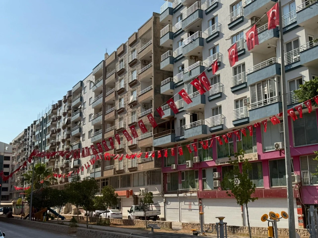 <div>Cumhurbaşkanı Recep Tayyip Erdoğan'ın partisinin 32. İstişare ve Değerlendirme Toplantısı'ndaki "Milletimizin fertleri arasına örülen terör duvarı yıkılmaktadır. Bırakınız tedirgin olmayı, aziz milletimizin her bir ferdi bu tablodan dolayı sevinmeli, bayram etmeli, Türkiye'nin her sokağı, caddesi, her hanesi ay yıldızlı bayrağımızla donatılmalıdır." çağrısı Kızıltepe ilçesinde de karşılık buldu.</div> <div>İlçede, kamu binaları ve caddelerin yanı sıra AK Parti İlçe Başkanlığı binasına Türk bayrakları asıldı.</div> <div></div> <div>(AA)</div>