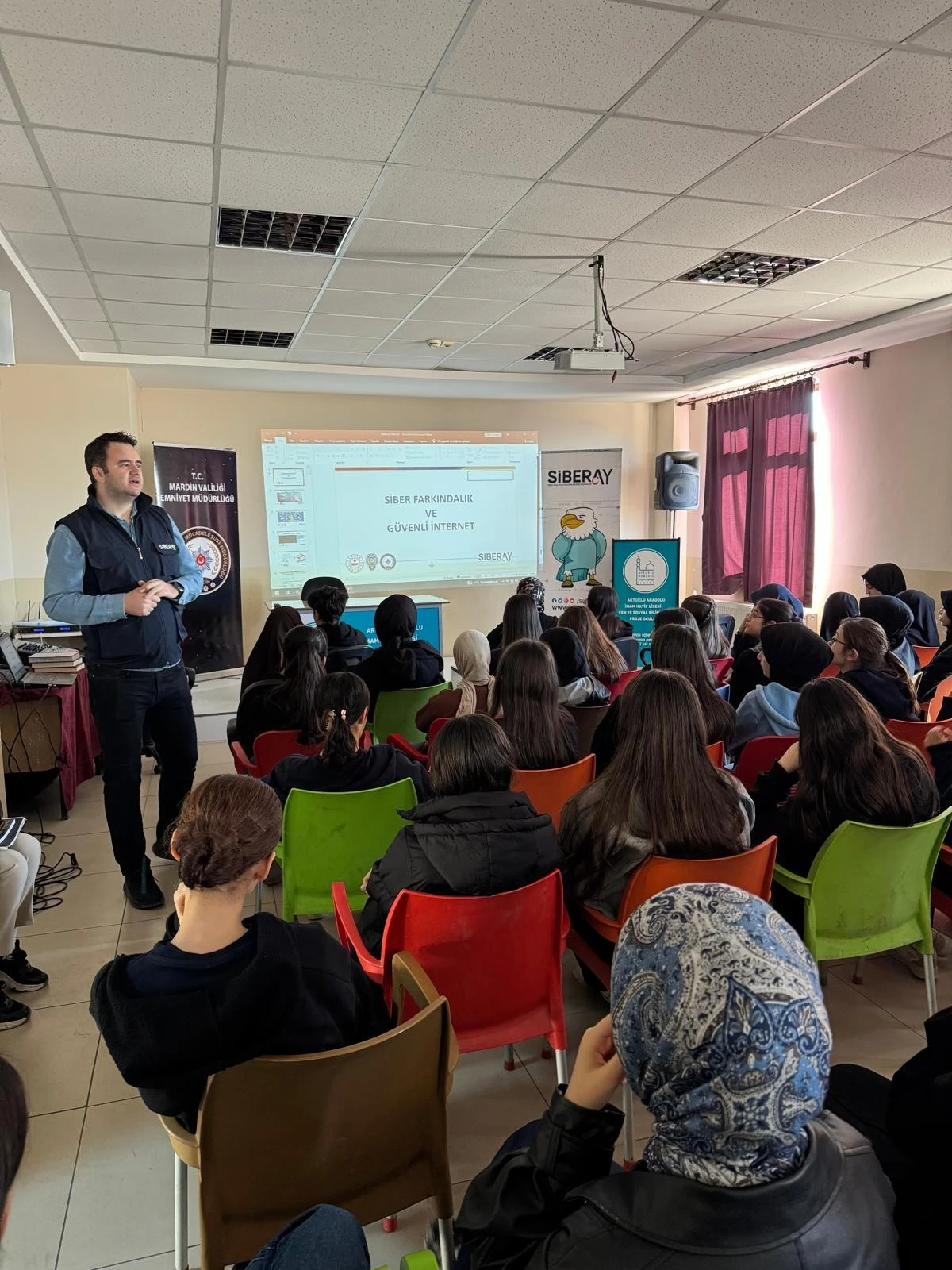 İl Emniyet Müdürlüğünün NSosyal hesabından yapılan paylaşıma göre, Siber Suçlarla Mücadele Şube Müdürlüğü ekiplerince Artuklu Anadolu İmam Hatip Lisesi öğrencilerine Siberay Projesi kapsamında bilgi verildi. <div>Ekipler, sosyal medya güvenliği, siber güvenlik, sosyal medyanın hayata etkisi, güvenli ve bilinçli internet kullanımı, teknoloji bağımlılığı, nitelikli dolandırıcılık ve siber zorbalık konularında öğrencilere bilgilendirme yaparak, broşür dağıttı.</div>