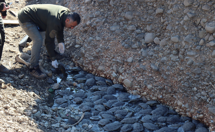 <div>Karakoyun Deresi'nin Sancaktar Mahallesi'nden geçen kısmında ıslah çalışmaları sırasında suyu kesilen dere yatağında mahsur kaldıkları çamurdan kurtarılan 316 kaplumbağa, Doğa Koruma ve Milli Parklar Şanlıurfa Bölge Müdürlüğü ekiplerince Gölpınar Yaban Hayvanı Kurtarma ve Rehabilitasyon Merkezi'ne götürüldü.</div> <div>Veteriner hekim tarafından kontrolleri yapılan kaplumbağalar, ekipler tarafından Atatürk Barajı Göleti kıyısına bırakıldı.</div> <div>Karakoyun Deresi'nin Sancaktar Mahallesi'nden geçen kısmında ıslah çalışmalarına katılan işçiler, dün suyu kesilen dere yatağında çamura saplanmış 316 kaplumbağa bulmuştu.</div> <div>(AA)</div>