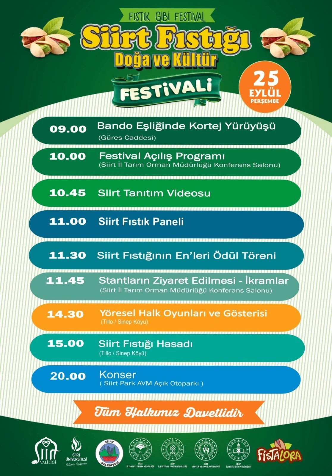 <div data-end="818" data-start="438">Festival, sabah saatlerinde Güres Caddesi’nde bando eşliğinde gerçekleştirilecek kortej yürüyüşü ile başlayacak. Ardından İl Tarım ve Orman Müdürlüğü Konferans Salonu’nda açılış programı düzenlenecek. Açılışın ardından Siirt tanıtım videosu izlenecek ve Siirt fıstığına dair panel gerçekleştirilecek. Programda ayrıca “Siirt Fıstığının En’leri” başlığıyla ödül töreni yapılacak.</div> <div data-end="1095" data-start="820">Öğle saatlerinde stantların ziyareti ve ikramlarla devam edecek festival, öğleden sonra Tillo’nun Sinep Köyü’nde halk oyunları ve yöresel gösterilerle renklenecek. Aynı bölgede gerçekleştirilecek fıstık hasadı etkinliği de festivalin dikkat çeken bölümlerinden biri olacak.</div> <div data-end="1220" data-start="1097">Günün sonunda ise Siirt Park AVM açık otoparkında sahne alacak Mithat Körler konseriyle festival coşkusu zirveye çıkacak.</div> <div data-end="1392" data-start="1222">Siirt’in tarihi, kültürü ve doğasıyla harmanlanan festival, kente hem renk hem de hareketlilik katmaya hazırlanıyor. Yetkililer, tüm halkı bu özel etkinliğe davet etti.</div>