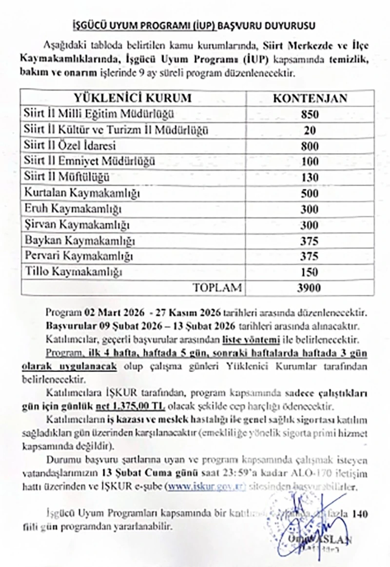 <div>Türkiye İş Kurumu (İŞKUR) tarafından yapılan duyuruya göre, Siirt il merkezi ile ilçelerdeki kamu kurumlarında istihdam edilmek üzere İşgücü Uyum Programı hayata geçirilecek. Program kapsamında temizlik, bakım ve onarım işlerinde görevlendirilmek üzere toplam 3 bin 900 kişi kamu kurumlarında geçici süreyle çalıştırılacak.</div> <div>Kontenjan dağılımı kurumlara göre belirlendi. Buna göre Siirt İl Milli Eğitim Müdürlüğüne 850 kişi, Siirt İl Özel İdaresine 800 kişi, Kurtalan Kaymakamlığına 500 kişi, Eruh ve Şirvan Kaymakamlıklarına ayrı ayrı 300’er kişi, Baykan ve Pervari Kaymakamlıklarına 375’er kişi, Tillo Kaymakamlığına 150 kişi ayrıldı. Ayrıca Siirt İl Müftülüğüne 130 kişi, Siirt İl Emniyet Müdürlüğüne 100 kişi ve Siirt İl Kültür ve Turizm Müdürlüğüne ise 20 kişilik kontenjan tahsis edildi.</div> <div>Programın 02 Mart 2026 tarihinde başlayacağı ve 27 Kasım 2026 tarihine kadar devam edeceği bildirildi. Uygulama süresince katılımcılar, ilk dört hafta boyunca haftada beş gün ve günde 7,5 saat çalışacak. İlk dört haftanın tamamlanmasının ardından ise haftada üç gün çalışma düzenine geçilecek.</div> <div>Başvuruların 09 Şubat 2026 ile 13 Şubat 2026 tarihleri arasında alınacağı açıklandı. Programa katılmak isteyen vatandaşların İŞKUR’a kayıtlı olmaları ve belirlenen şartları taşımaları gerekiyor. Program süresince katılımcıların çalıştıkları günler için iş kazası ve meslek hastalığı sigortası ile genel sağlık sigortası primlerinin İŞKUR tarafından karşılanacağı belirtildi.</div> <div>Başvuruların İŞKUR e-Şube üzerinden ya da ALO 170 hattı aracılığıyla yapılabileceği kaydedilirken, programın kamu hizmetlerinin aksamadan yürütülmesine katkı sağlaması ve iş arayan vatandaşlara geçici de olsa gelir ve çalışma deneyimi kazandırmasının hedeflendiği ifade edildi.</div> <div></div>