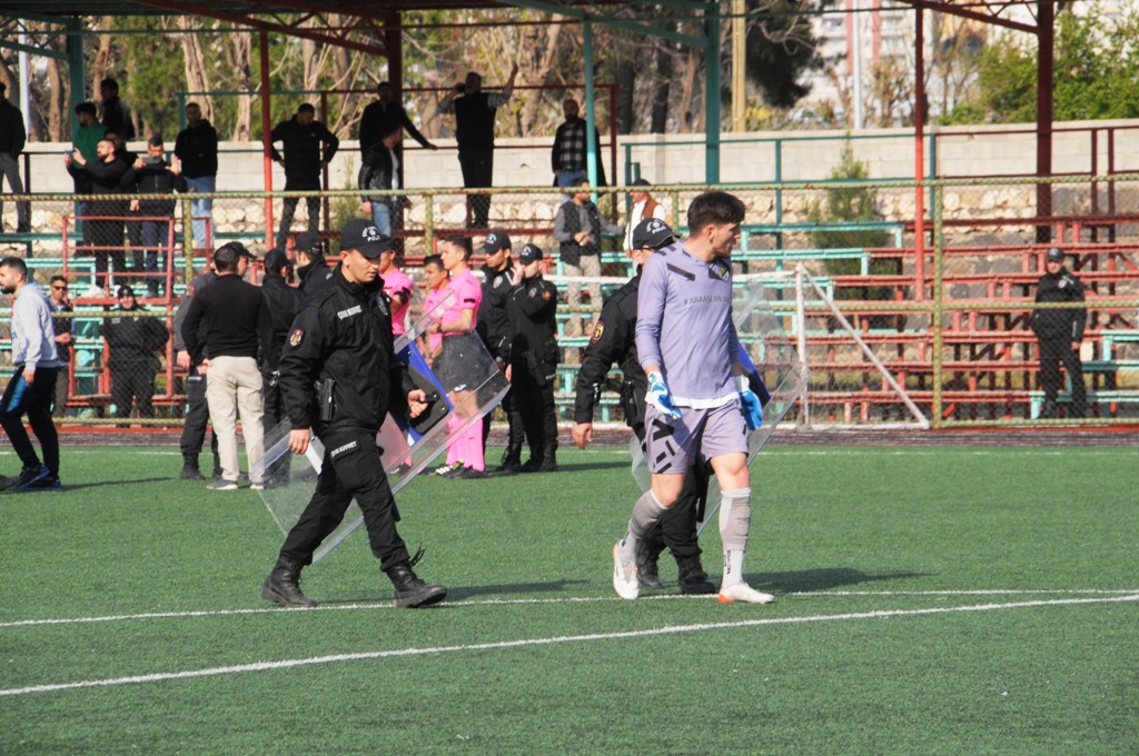 <div>Hamit Özalp Stadyumu'nda oynanan karşılaşmanın 87. dakikasında Yeşil Varto Spor, İsmail Can Taşkıran'ın attığı golle 1-0 öne geçti.</div> <div>Golün ardından oyuncular arasında tartışma yaşandı, karşılaşmanın hakemi Hasan Basri Beyter, Yeşil Varto Spor kalecisi Sabri Can'a sarı kart gösterdi.</div> <div>Saha içindeki tartışmaların tribünlere de yansıması üzerine polis ekipleri taraftarları yatıştırmaya çalıştı.</div> <div>Karşılaşmanın hakemi Hasan Basri Beyter, yaşanan arbedede tarafların yatışmaması üzerine maçı tatil etti.</div>