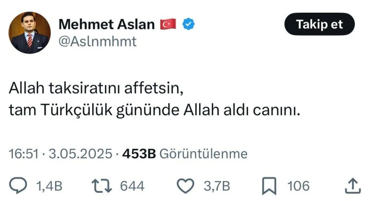 <div>DEM Parti Milletvekili Sırrı Süreyya Önder'in hayatını kaybetmesinin ardından İYİ Partili Mehmet Aslan tepki çeken bir paylaşım yaptı.</div> <div>Aslan sosyal medya hesabından, "Allah taksiratını affetsin, tam Türkçülük gününde Allah aldı canını" ifadelerini kullandı. Bu paylaşım, yurttaşlar tarafından tepki ile karşılandı. Aslan, bu paylaşımını sildi.</div> <div></div> <div>YENİDEN PAYLAŞIM YAPTI</div> <div>Tepkilerin ardından İYİ Partili Aslan'ın yaptığı yeni açıklama ise şu şekilde:</div> <div>"Daha önce de söylemiştim, ne ölüm döşeğinde, ne de ölmüş bir insanın arkasından konuşmam. Ölmüşün arkasından Allah rahmet eylesin ya da Allah taksiratını affetsin denir!</div> <div>Ben de öyle dedim. Sonraki ifadem ise, ölüm günü babasını kaybetmiş bir kız evlada,ailesine ve de hassasiyeti olan iyi insanlara ağır olduğunu fark ettiğim, bu durumun da bana yakışmadığı için paylaşımı sildim.</div> <div>Yanlışta ısrar edilmez! Bu arada paylaşımın altına, ölmüşün arkasından konuşulmaz diyip yedi düvel ölmüşlerimize hakaret eden, iftira eden müptezellerle tek tek hesaplacağız!"</div>