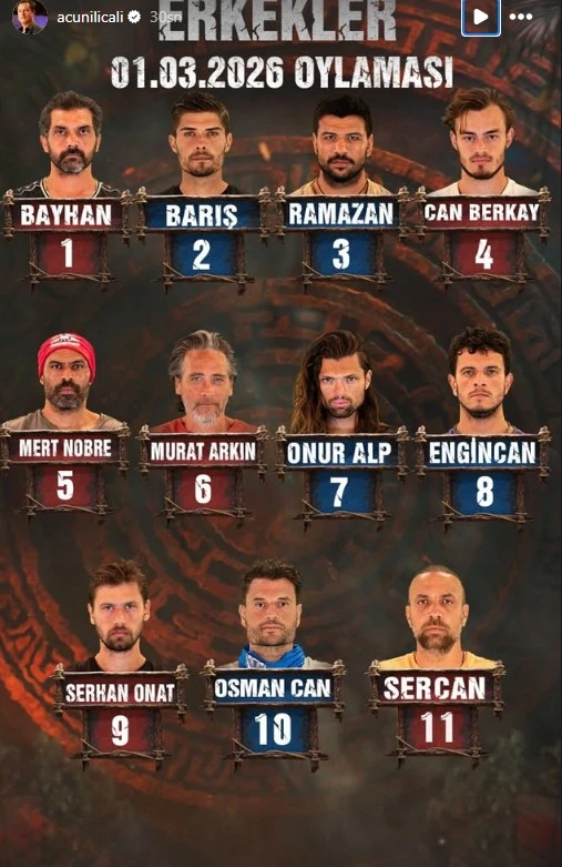 <div>Açıklanan oylama sonuçları, hem zirvede yer alan isimlerin güçlü desteğini hem de alt sıralarda yaşanan rekabeti ortaya koydu. İzleyicilerin oylarıyla belirlenen sıralama, yarışmanın ilerleyen bölümlerinde dengeleri değiştirebilecek önemli bir gösterge olarak değerlendiriliyor.</div> <div><strong>Erkekler Halk Oylaması Sıralaması (7 Mart 2026)</strong></div> <div>Paylaşılan listeye göre erkek yarışmacıların halk oylamasındaki sıralaması şu şekilde oluştu:</div> Bayhan Barış Ramazan Can Berkay Ertemiz Mert Nobre Murat Arkın Onur Alp Engin Can Serhan Onat Osman Can Sercan Yıldırım <div><strong>Zirvede Bayhan Var</strong></div> <div>Halk oylamasında ilk sırayı alan Bayhan, izleyicilerden aldığı güçlü destekle listenin zirvesinde yer aldı. Onu ikinci sırada Barış ve üçüncü sırada Ramazan takip etti. Bu sonuçlar, özellikle ilk üç sıradaki yarışmacıların seyirci nezdindeki popülerliğini bir kez daha ortaya koydu.</div> <div><strong>Rekabet Alt Sıralarda Da Sürüyor</strong></div> <div>Listenin alt sıralarında ise rekabetin oldukça çekişmeli olduğu görülüyor. Özellikle dokuzuncu sıradaki Serhan Onat, onuncu sıradaki Osman Can ve on birinci sıradaki Sercan Yıldırım için önümüzdeki haftalarda yapılacak oylamalar büyük önem taşıyacak.</div> <div>Her hafta değişebilen halk oylaması sonuçları, Survivor’da kimin avantajlı olduğunu gösteren önemli göstergelerden biri olarak değerlendiriliyor. İzleyicilerin oylarıyla şekillenen sıralama, ilerleyen günlerde yarışmanın kaderini belirleyebilecek gelişmelerin de habercisi olabilir.</div> <div> </div>