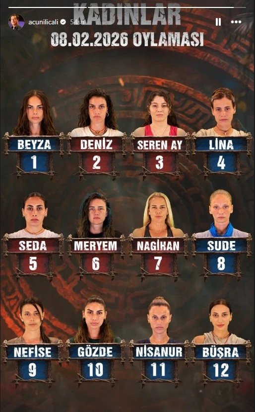 <div data-end="337" data-start="93"></div> <div data-end="651" data-start="339">Paylaşılan listede yarışmacıların halk oylamasındaki yerleri tek tek gösterildi. Buna göre kadın yarışmacılar arasında en yüksek oyu alan isim <strong data-end="491" data-start="482">Beyza</strong> olurken, onu <strong data-end="514" data-start="505">Deniz</strong> ve <strong data-end="530" data-start="518">Seren Ay</strong> takip etti. Oylama sonuçları ada içindeki dengeleri ve ilerleyen bölümlerdeki eleme süreçlerini de doğrudan etkileyecek.</div> <div data-end="717" data-start="653">Açıklanan 12 Şubat kadınlar halk oylaması sıralaması şöyle oldu:</div> <div data-end="729" data-start="722">Beyza</div> <div data-end="740" data-start="733">Deniz</div> <div data-end="754" data-start="744">Seren Ay</div> <div data-end="764" data-start="758">Lina</div> <div data-end="774" data-start="768">Seda</div> <div data-end="786" data-start="778">Meryem</div> <div data-end="799" data-start="790">Nagihan</div> <div data-end="809" data-start="803">Sude</div> <div data-end="821" data-start="813">Nefise</div> <div data-end="833" data-start="826">Gözde</div> <div data-end="847" data-start="838">Nisanur</div> <div data-end="859" data-start="852">Büşra</div> <div data-is-only-node="" data-is-last-node="" data-end="1046" data-start="861"></div>