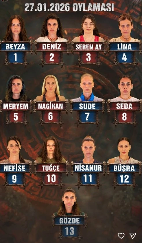 <div></div> <div data-end="599" data-start="355">Paylaşılan sonuçlara göre halk oylamasında ilk sırada Beyza yer aldı. Beyza’yı Deniz ikinci, Seren Ay üçüncü ve Lina dördüncü sırada takip etti. Oylamada orta sıralarda ise Meryem, Nagihan, Sude ve Seda yer aldı.</div> <div data-end="812" data-start="601">Listenin devamında Nefise dokuzuncu, eleme potasında bulunan Tuğçe ise onuncu sırada yer aldı. Nisanur on birinci, Büşra on ikinci sırada yer alırken, oylamada en az oyu alan isim Gözde oldu.</div> <div data-end="874" data-start="814">31 Ocak 2026 Survivor Kadınlar Halk Oylaması Sıralaması:</div> Beyza Deniz Seren Ay Lina Meryem Nagihan Sude Seda Nefise Tuğçe Nisanur Büşra Gözde <div data-is-only-node="" data-is-last-node="" data-end="1314" data-start="1029">Survivor Ünlüler-Gönüllüler’de halk oylaması sonuçları, ada konseyinde şekillenen eleme süreci açısından belirleyici rol oynarken, yarışmadaki dengelerin önümüzdeki bölümlerde nasıl değişeceği merak konusu oldu.</div> <div>Paylaşılan oylama tablosuna göre erkek yarışmacılar arasında ilk sırada Bayhan yer aldı. Bayhan’ı ikinci sırada Murat Arkın, üçüncü sırada ise Onur Alp takip etti. Dördüncü sırada Serhan Onat, beşinci sırada Mert Nobre, altıncı sırada ise Erkan kendine yer buldu.</div> <div>Oylamada yedinci sırada Ramazan, sekizinci sırada Eren, dokuzuncu sırada Engincan yer alırken, listenin onuncu sırasında Can bulunuyor.</div> <div>Halk oylaması sonuçları, yarışmacıların izleyici nezdindeki popülerliğini bir kez daha gözler önüne sererken, ilerleyen bölümlerde ada dengelerini nasıl etkileyeceği ise merak konusu oldu.</div> <div></div>