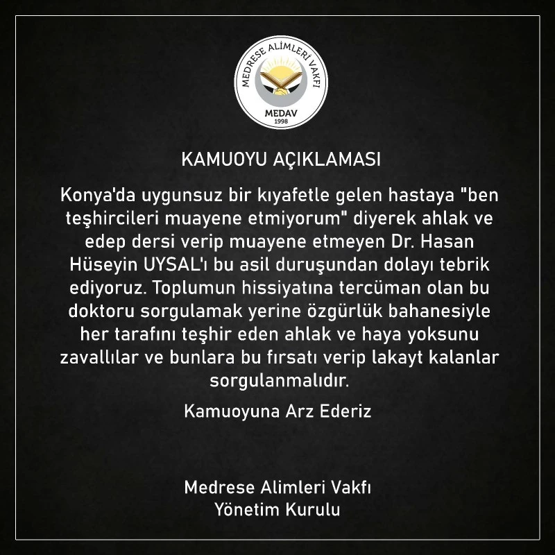 <div></div> <div>Vakfın yönetim kurulundan yapılan yazılı açıklamada, Dr. Uysal’ın “Ben teşhircileri muayene etmiyorum” sözleriyle toplumun ahlak hassasiyetine dikkat çektiği belirtilerek, bu tutumundan dolayı kendisinin tebrik edildiği kaydedildi.</div> <div>Açıklamada şu ifadelere yer verildi:</div> <div>“Toplumun hissiyatına tercüman olan bu doktoru sorgulamak yerine, özgürlük bahanesiyle her tarafını teşhir eden ahlak ve haya yoksunu kişiler ve bunlara bu fırsatı verip lakayt kalanlar sorgulanmalıdır.”</div> <div><strong>Sağlık Bakanlığı ve valilik soruşturma başlattı</strong></div> <div>Öte yandan Sağlık Bakanlığı ve Konya Valiliği, söz konusu olayla ilgili idari soruşturma başlatıldığını duyurdu. Bakanlıktan yapılan açıklamada, “Bazı basın yayın organları ve sosyal medya mecralarında yer alan haberler üzerine ilgili personel hakkında tahkikat titizlikle yürütülmektedir” ifadeleri kullanıldı.</div> <div>Konya İl Sağlık Müdürlüğü ise olayın ardından hastanın başka bir hekim tarafından muayene edildiğini bildirdi.</div> <div>Sosyal medyada yayılan görüntülerde, genç kadının muayene olmak için gittiği poliklinikte Dr. Uysal tarafından “teşhirci” olarak nitelendirildiği ve bunun üzerine muayenenin gerçekleşmediği görüldü.</div> <div> </div> <div>(Haber Merkezi)</div> <div> </div>