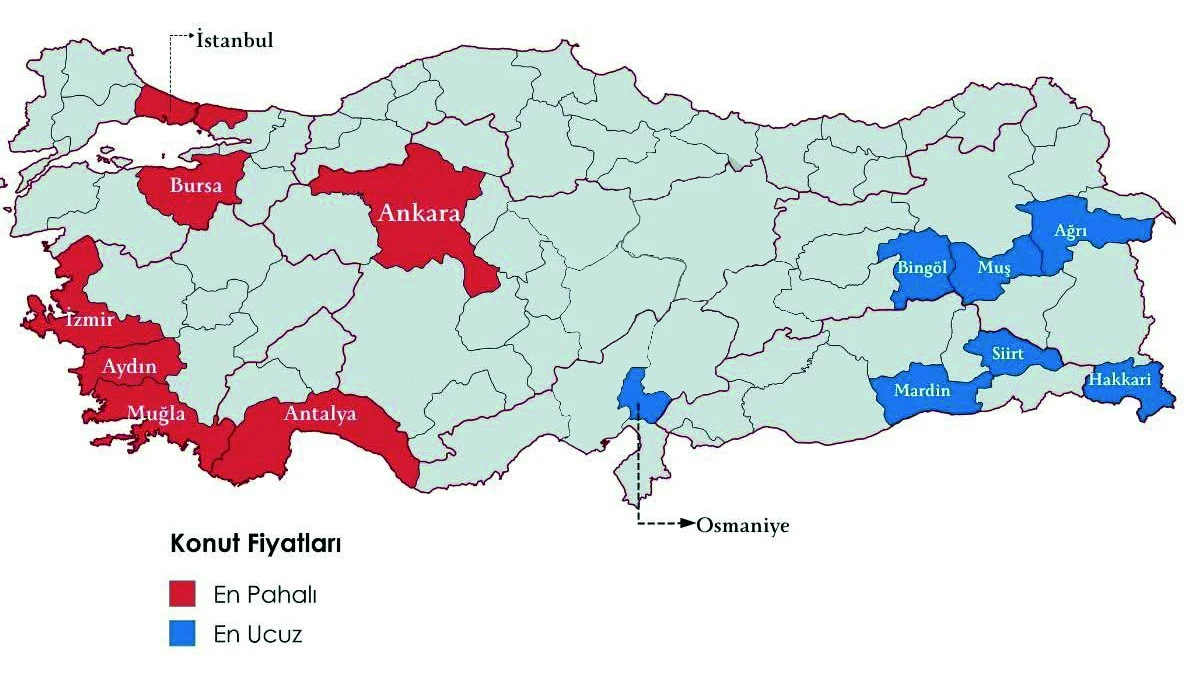 <div>Yapay zeka destekli harita analizine göre Türkiye’de satılık konut fiyatlarında en ucuz iller ve en pahalı iller belirlendi. Analize göre, Siirt, Türkiye genelinde konut fiyatlarının en düşük olduğu iller arasında ilk sırada yer aldı.</div> <div>Haritada mavi renkle işaretlenen ve konut fiyatlarının en uygun seviyelerde olduğu 7 il şunlar oldu: Siirt, Hakkari, Mardin, Muş, Bingöl, Ağrı ve Şırnak. Özellikle Siirt, hem yatırımcılar hem de ev sahibi olmak isteyenler için cazip fırsatlar sunan iller arasında öne çıktı.</div> <div>Uzmanlar, Siirt’te konut fiyatlarının düşük olmasını, kentteki nüfus artış hızının düşük olması, sanayi yatırımlarının sınırlı kalması ve göç veren bir il olması gibi nedenlerle açıklıyor. Ancak son yıllarda artan kamu yatırımları, sosyal konut projeleri ve altyapı çalışmaları ile birlikte Siirt’te gayrimenkul piyasasında hareketlilik bekleniyor.</div> <div>Buna karşılık, Türkiye’de konut fiyatlarının en yüksek olduğu iller ise haritada kırmızıyla gösterildi. Yapay zeka analizine göre İstanbul, Ankara, İzmir, Bursa, Antalya, Muğla ve Aydın, satılık konutların en pahalı olduğu 7 il olarak belirlendi. Özellikle kıyı bölgelerinde bulunan bu illerde, turizm yoğunluğu, arsa kıtlığı ve yüksek talep nedeniyle fiyatlar hızla artmaya devam ediyor.</div> <div> </div> <div>(Eren ÇİFTLİK)</div> <div> </div>