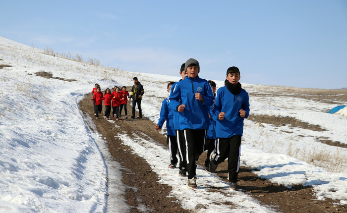 Okulun bahçesindeki koordinasyon parkurunda antrenman yapan öğrenciler, haftanın 3 günü de köyün sokaklarında karla kaplı araziler arasında koşuyor.