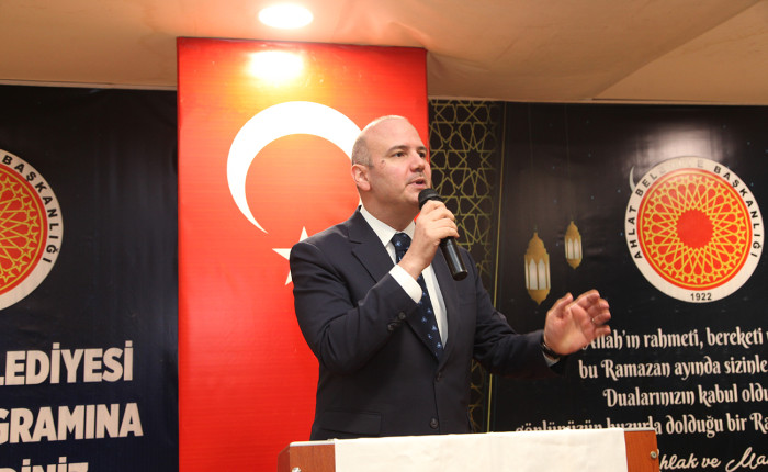 Ahlat Belediye Başkanı Yavuz Gülmez de iftar programına katılanlara teşekkür ederek, belediyenin çalışmalarını anlattı.