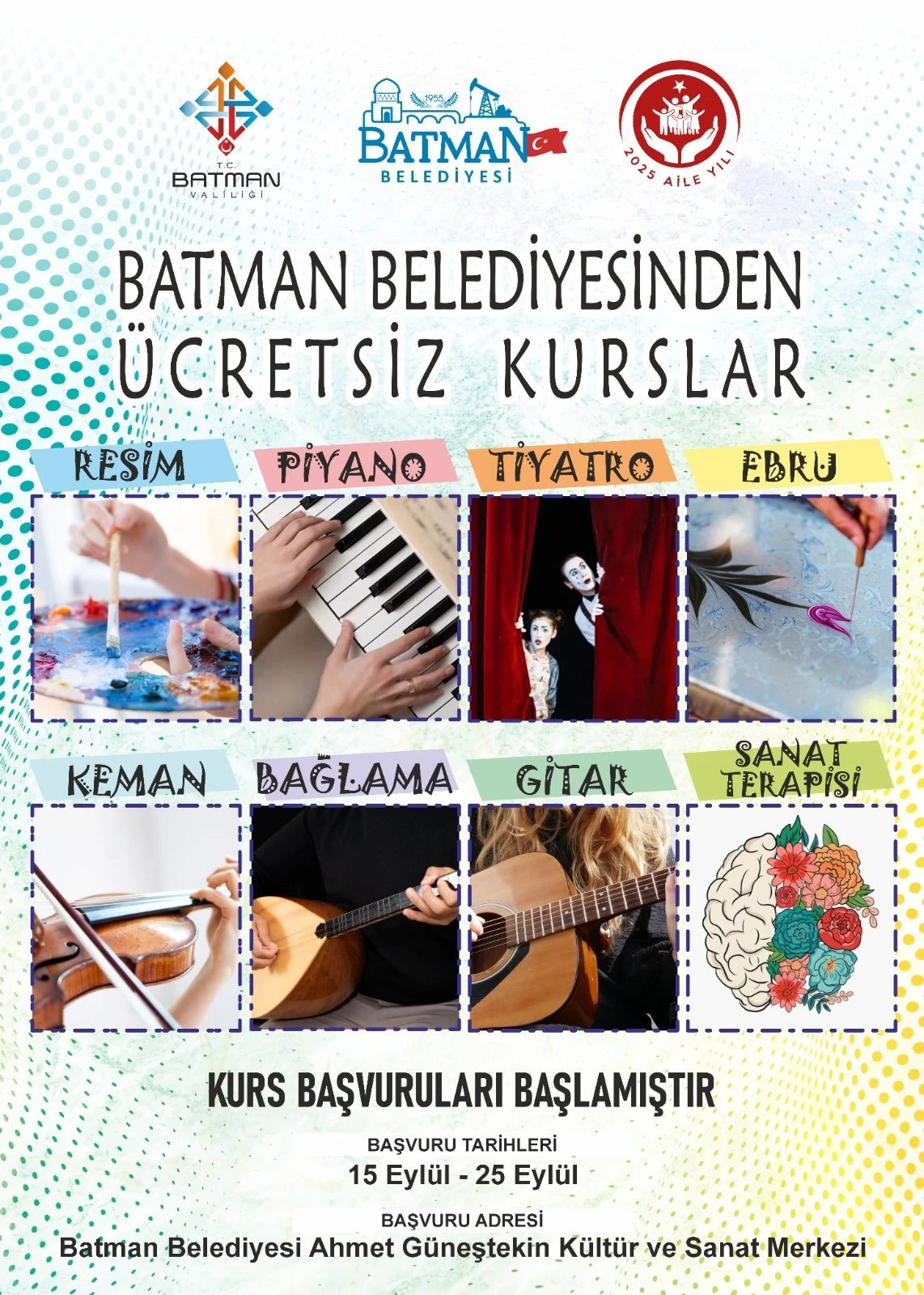 Batman Belediyesi, sanatın farklı dallarına ilgi duyan tüm vatandaşları bu ücretsiz kurslara katılmaya davet etti.