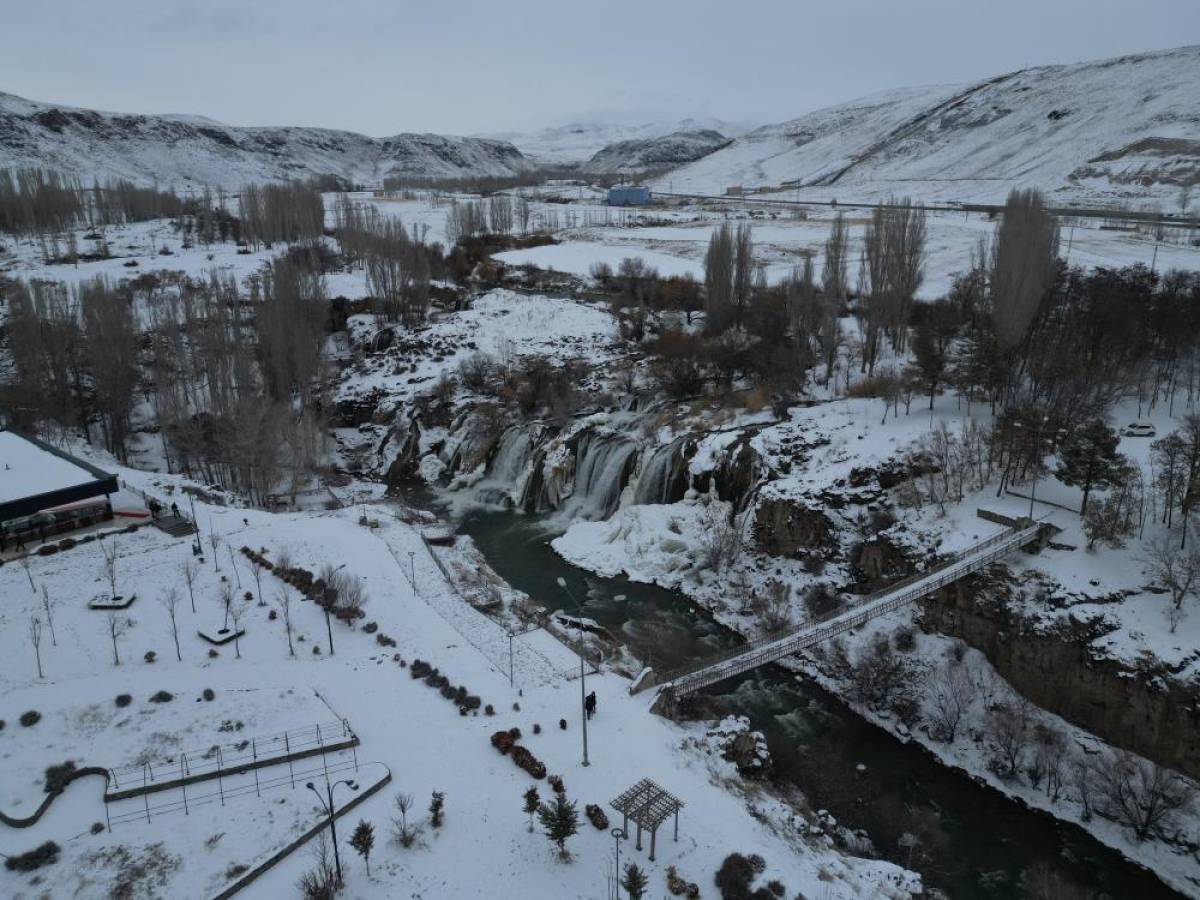 Soğuk hava nedeniyle kısmen donan şelale ve çevresi, dün etkili olan kar yağışıyla beyaza büründü.