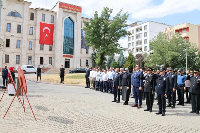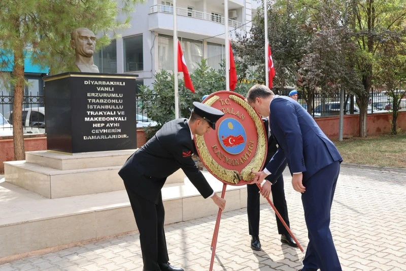 Kaymakamlık binası önünde gerçekleştirilen törende; Kaymakamlık ile Güvenlik Korucuları, Şehit ve Gazi Aileleri Yardımlaşma Derneği tarafından Atatürk Anıtı’na çelenk sunuldu. Ardından saygı duruşunda bulunuldu ve İstiklal Marşı okundu.
