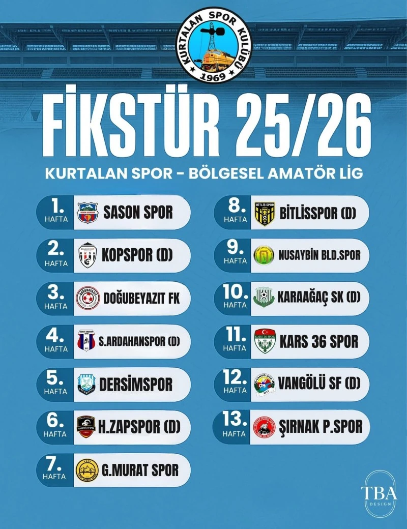 Fikstüre göre Kurtalan Spor, ikinci haftada deplasmanda Kopsor ile karşılaşacak. Üçüncü haftada Doğubeyazıt FK’yı ağırlayacak olan takım, dördüncü haftada Serhat Ardahanspor deplasmanına gidecek. Beşinci haftada Dersimspor’u konuk edecek olan Kurtalan Spor, altıncı haftada Hakkari Zapspor ile deplasmanda oynayacak. Yedinci haftada ise kendi sahasında G. Murat Spor ile karşılaşacak.