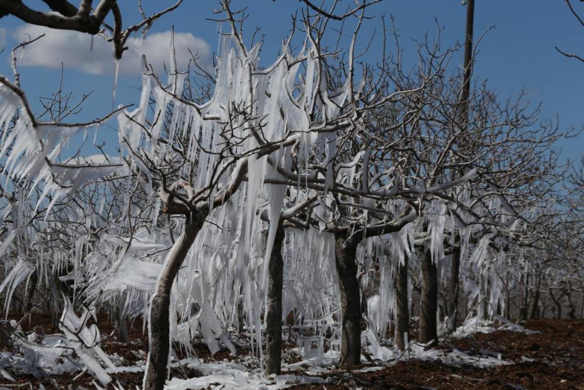 Merkez Karaköprü ilçesine bağlı kırsal Esemkulu Mahallesinde Mehmet Aslan'a ait fıstık bahçesinde bazı ağaçlarda bir metreyi aşan buz sarkıtları oluştu.