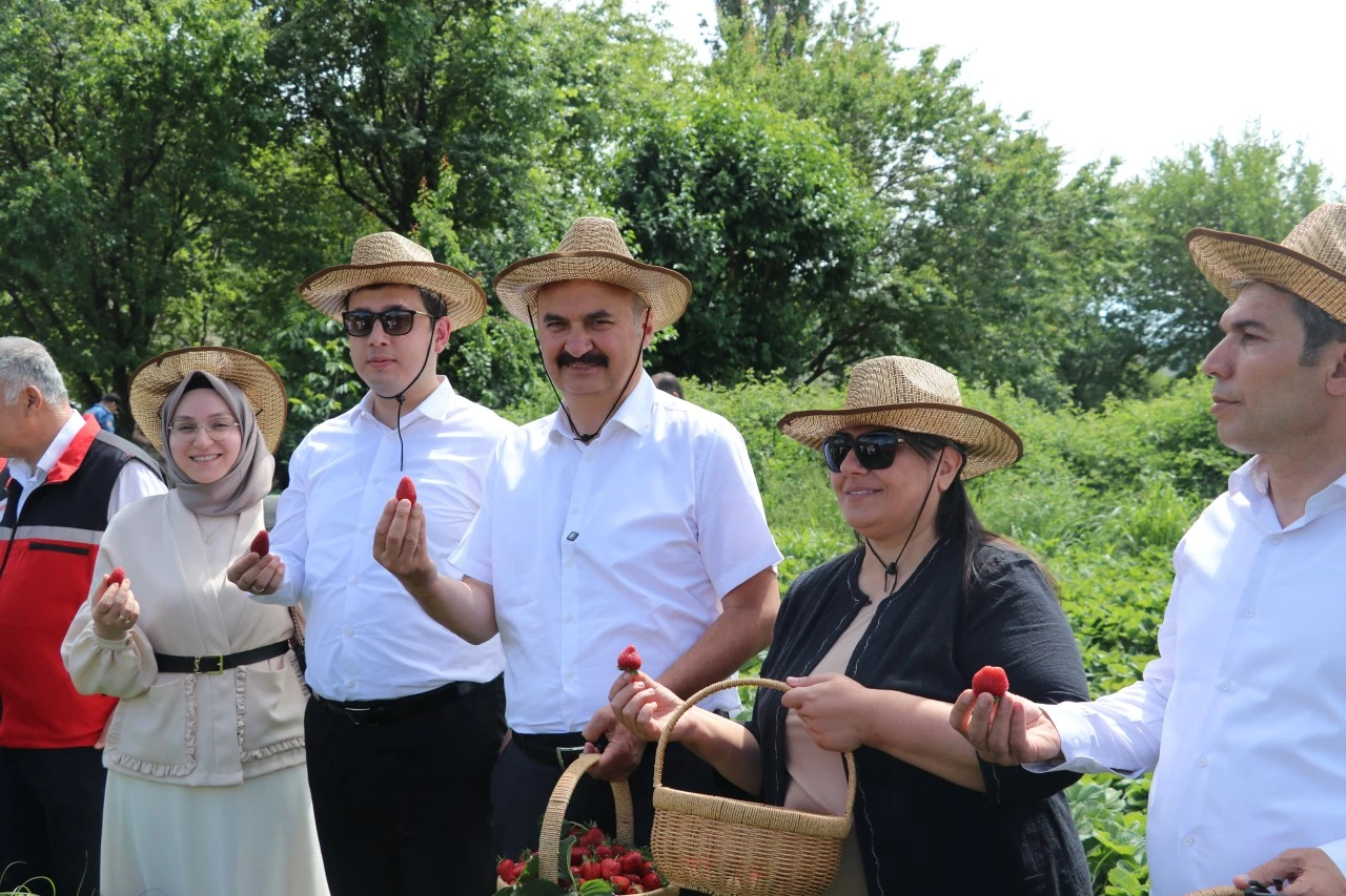 Batman Valisi Ekrem Canalp, ilçeye bağlı Dumlupınar Mahallesi'nde düzenlenen hasat şenliğinde üreticilerle bahçede çilek topladı.