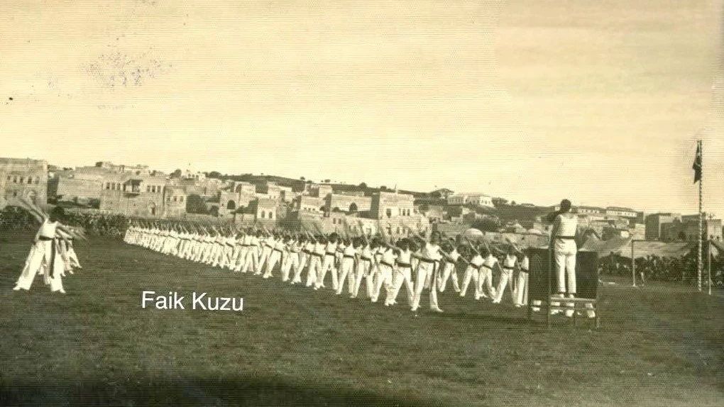 Fotoğrafta, Siirt halkının “Meyden Tayyara” olarak adlandırdığı bölgede gerçekleştirilen gösteriler yer alıyor. Görselin en üst sağ tarafında, Aynsalip Çeşmesi’nin üst kısmında bulunan ve o dönemde askeriye tarafından kullanılan eski Siirt merkezine ait binalar dikkat çekiyor. Öğrencilerin arkasında ise kentin efsanevi mahallelerinden biri olan Doğan Mahallesi (Ğolaniye) bulunuyor.