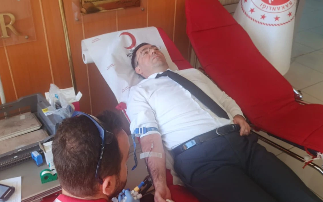 Başsavcı Tuğan Sarıca kendisinin kan bağışlayarak bu vazifenin mutluluğu içerisinde hissettiğini söyleyerek, örnek bir tablo sergiledi.