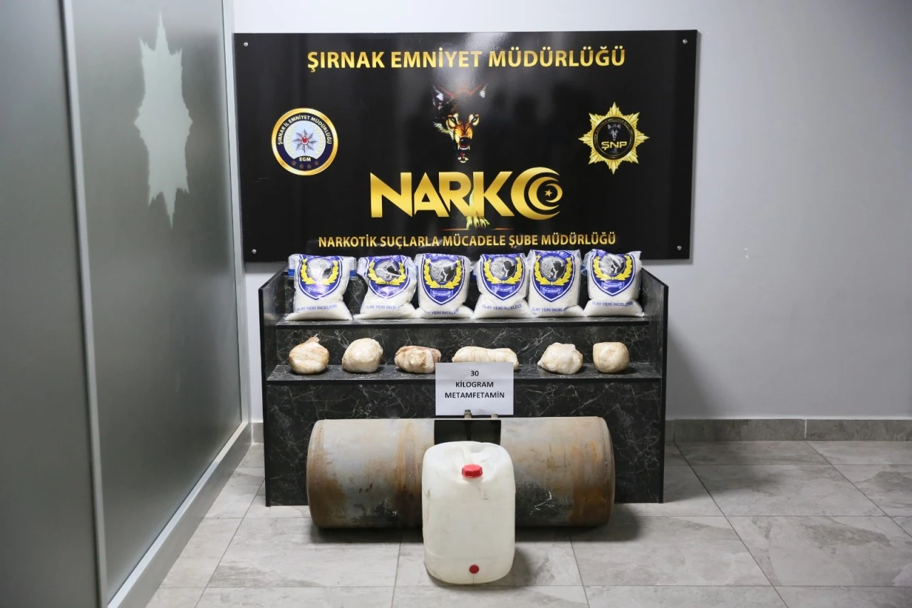 Narkotik köpeği "Hector"un da katıldığı aramada, aracın dingilinin üzerinde ve yağ deposuna gizlenmiş 12 pakette 30 kilogram metamfetamin bulundu.