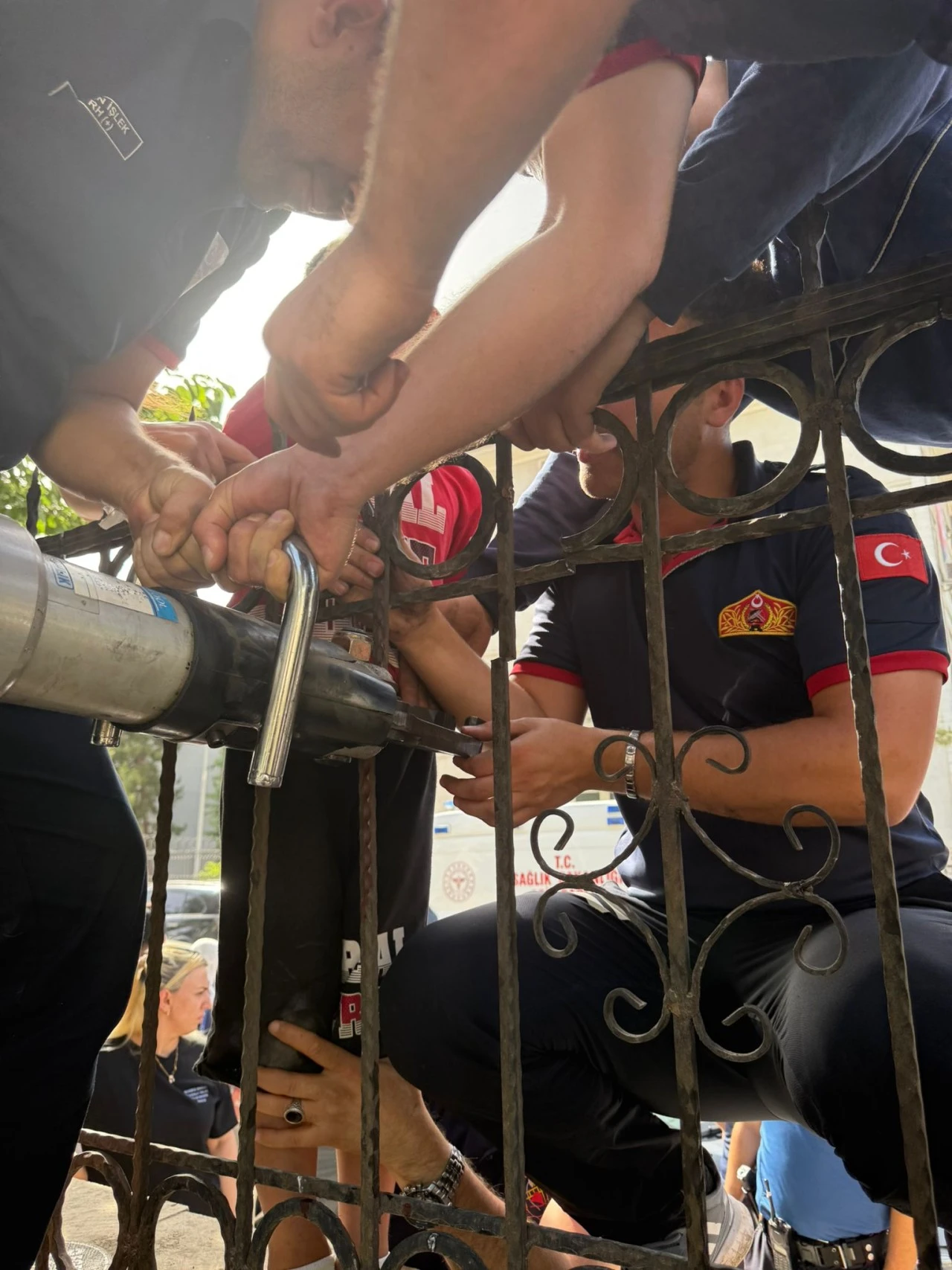 Çevredekilerin ihbarı üzerine olay yerine sevk edilen itfaiye ekipleri, korkuluk demirini kesti.